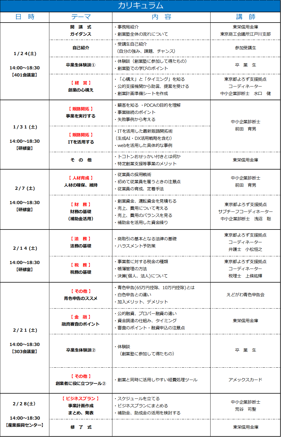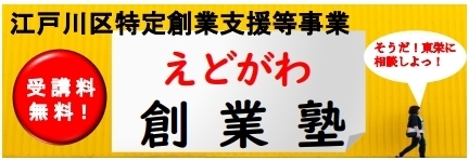 | 参加対象者 | ・これから江戸川区で創業される方 ・江戸川区内で創業5年以内の方 ・全日程に参加可能な方 |